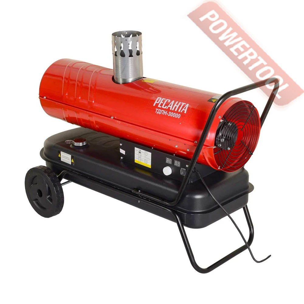 Дизельная тепловая пушка непрямого нагрева РЕСАНТА ТДПН-30000 - жидкотопливный нагреватель воздуха непрямого нагрева, характеризуются высокой эффективностью при обогреве больших помещений, обеспечивая чистый и теплый воздух. Применяется для обогрева закрытых помещений со средним уровнем вентиляции: магазинов, палаток, при проведении выставочных и развлекательных мероприятий. Тепловая пушка оптимальна для работы при строительстве, ремонте и эксплуатации жилых зданий и торговых площадей с вентиляцией. Широко применяется на строительных площадках для прогрева бетона при отрицательных температурах воздуха. Само устройство можно запустить и на улице. При внутреннем монтаже, обязательна подача свежего воздуха, так как процесс горения активно расходует кислород. Также внутренний монтаж в обязательном порядке предусматривает наличие дымоходной трубы на выходном газовом патрубке.