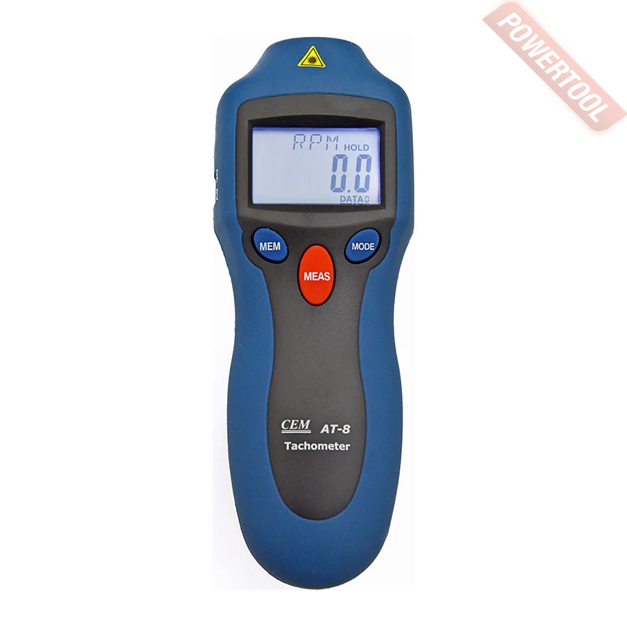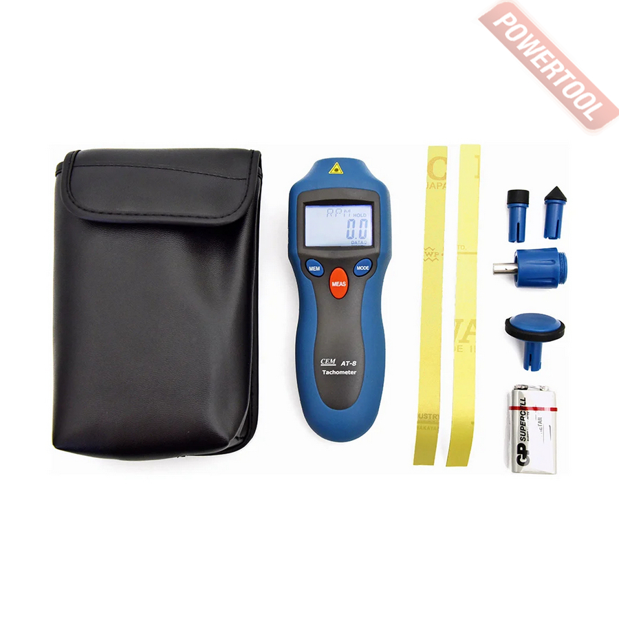 Время измерения не превышает 0,5 секунд при оборотах ротора свыше 120 об/мин. Дистанция от прибора до объекта измерений при бесконтактном способе может лежать в диапазоне от 5 до 50 сантиметров. Цифровой тахометр AT-8 оснащен большим пятизначным дисплеем с подсветкой для работы в условиях недостаточной освещенности. Встроенная память позволяет запомнить до 40 измеренных значений. Питание тахометра AT-8 осуществляется от одной 9-вольтовой батарейки типа "Крона", обеспечивающей длительную эксплуатацию прибора.