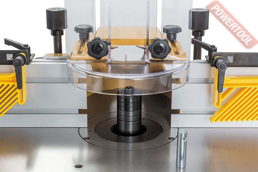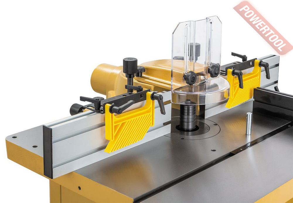 Фрезерный упор имеет усовершенствованную конструкцию с увеличенными накладками из алюминиевого профиля. Для регулировки его сдвигают целиком, ослабив два фиксатора. Винтовой механизм с миллиметровой шкалой позволяет отдельно настраивать положение задней накладки (величиной выступа регулируют глубину съёма). В качестве верхних прижимов заготовки используются пластиковые «гребёнки», в том числе страхующие от обратного выброса.