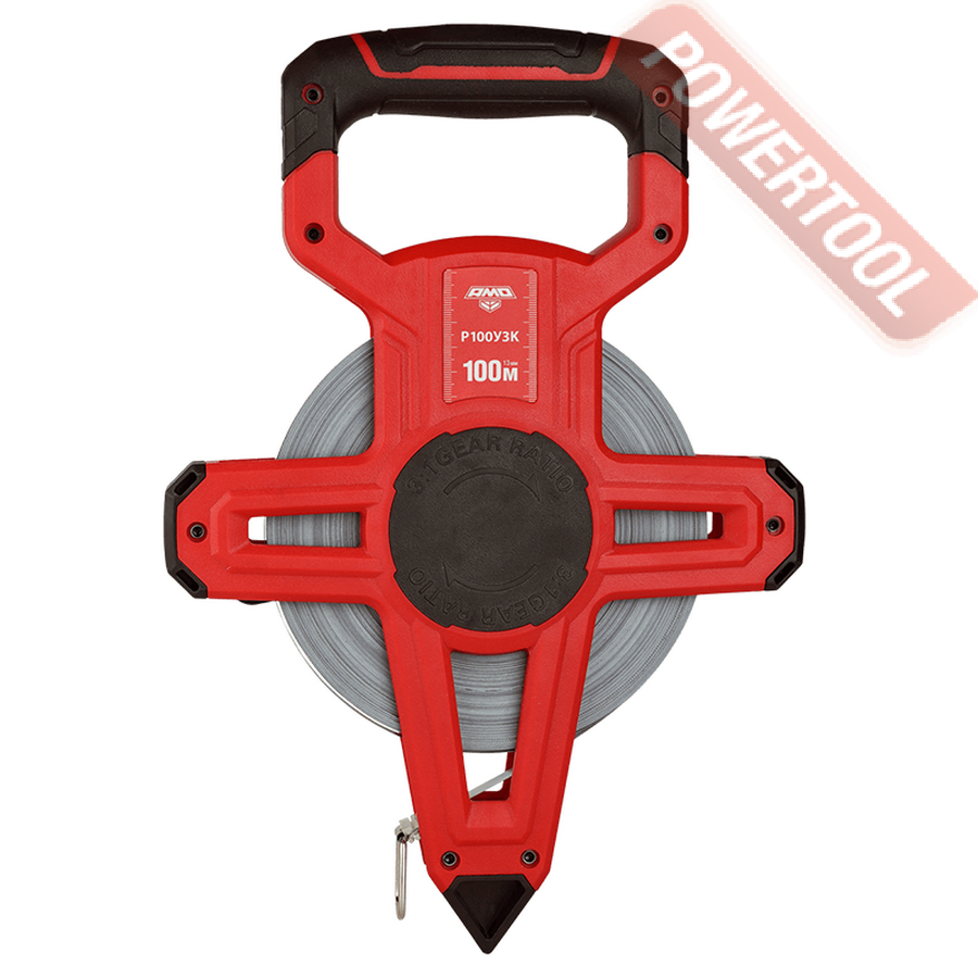 Полотно измерительной рулетки с закрепленным на конце кольцом изготовлено из углеродистой стали, за счет чего мало подвержено растяжению и деформациям, обладая более продолжительным эксплуатационным ресурсом, по сравнению с фиберглассовой лентой. Метод прямых измерений, с непосредственным считыванием показаний с миллиметровой шкалы, позволяет точно фиксировать начальную и конечную точку при выполнении замеров, не допуская ошибки наведения на предельных дистанциях, как у лазерных дальномеров. Открытый пластиковый корпус снабжен верхней ручкой и заостренным концом в нижней части для установки инструмента в выбранной точке. Механизм сматывания ленты редукционного типа позволяет путем вращения ручки быстро приводить рулетку в исходное состояние после замера.