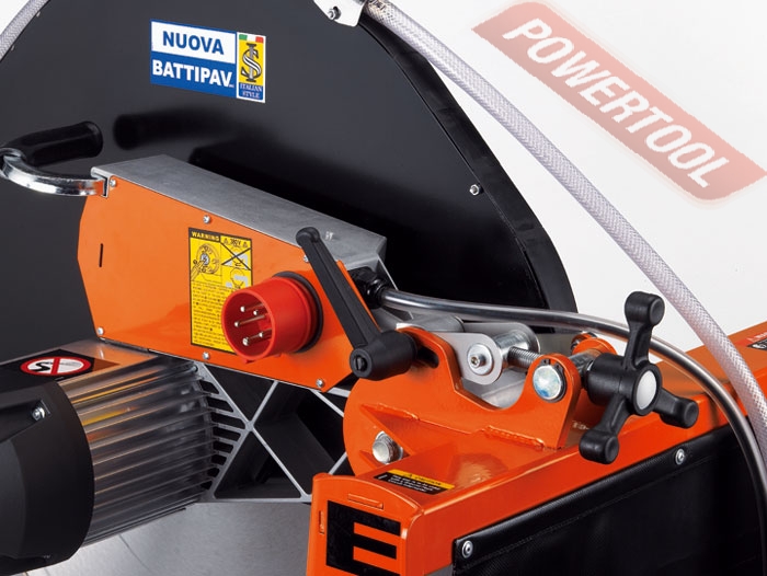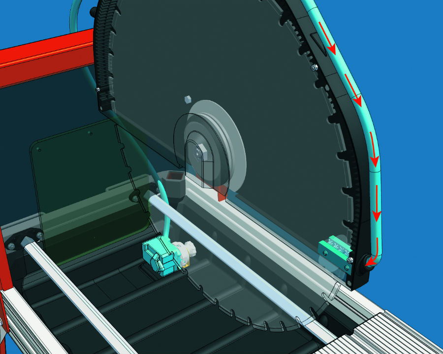SPRAY SYSTEM - это система подачи воды на алмазный диск. Вода направлена на три важных точки алмазного диска: спереди и с обоих боков режущей кромки. Предотвращает образование пыли при резке и увеличивает срок службы алмазного лезвия,создавая поток воды внутри кожуха диска.