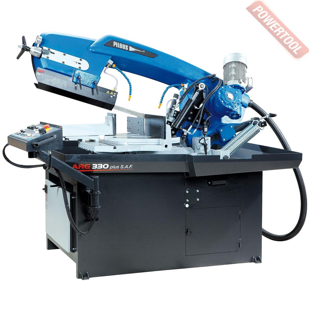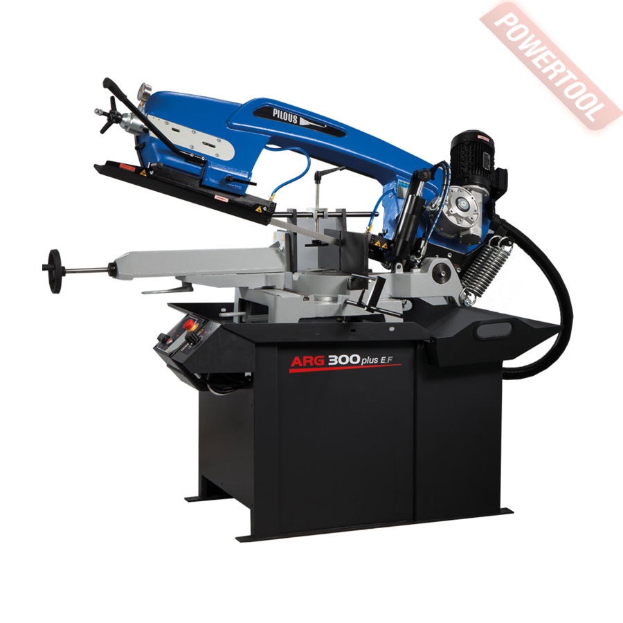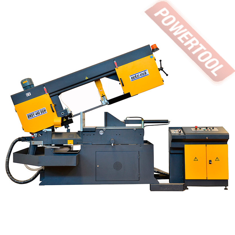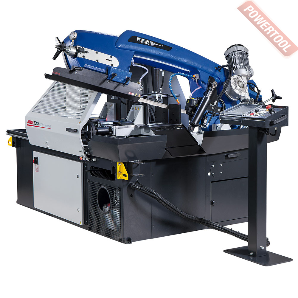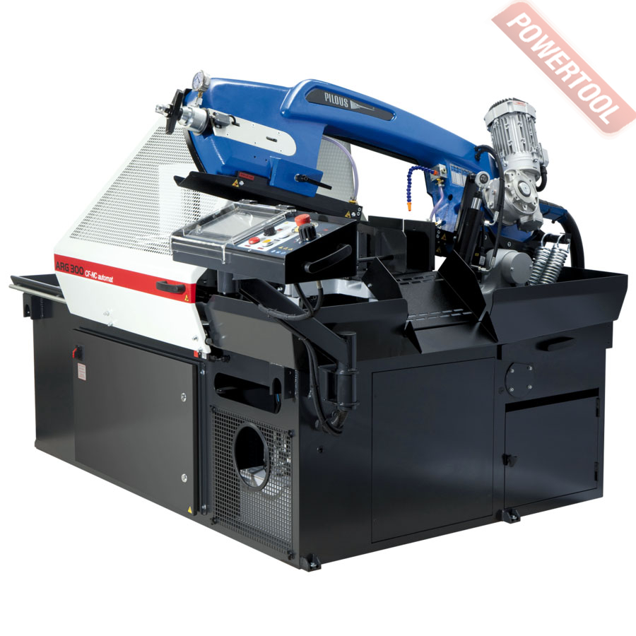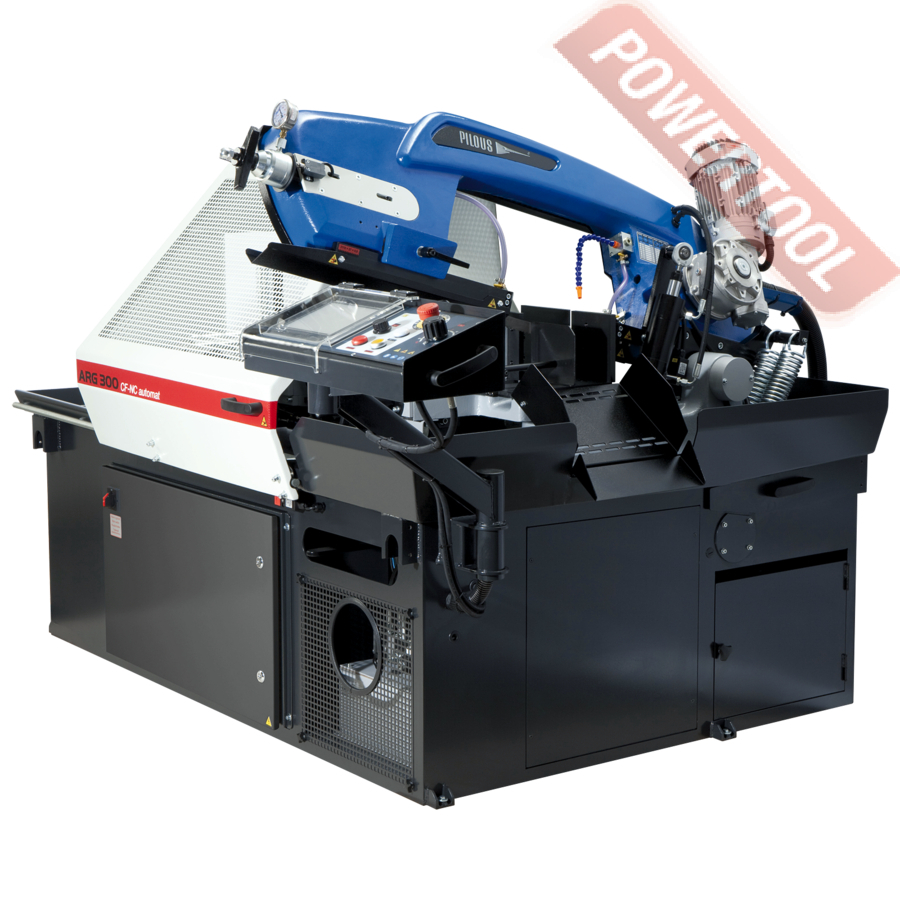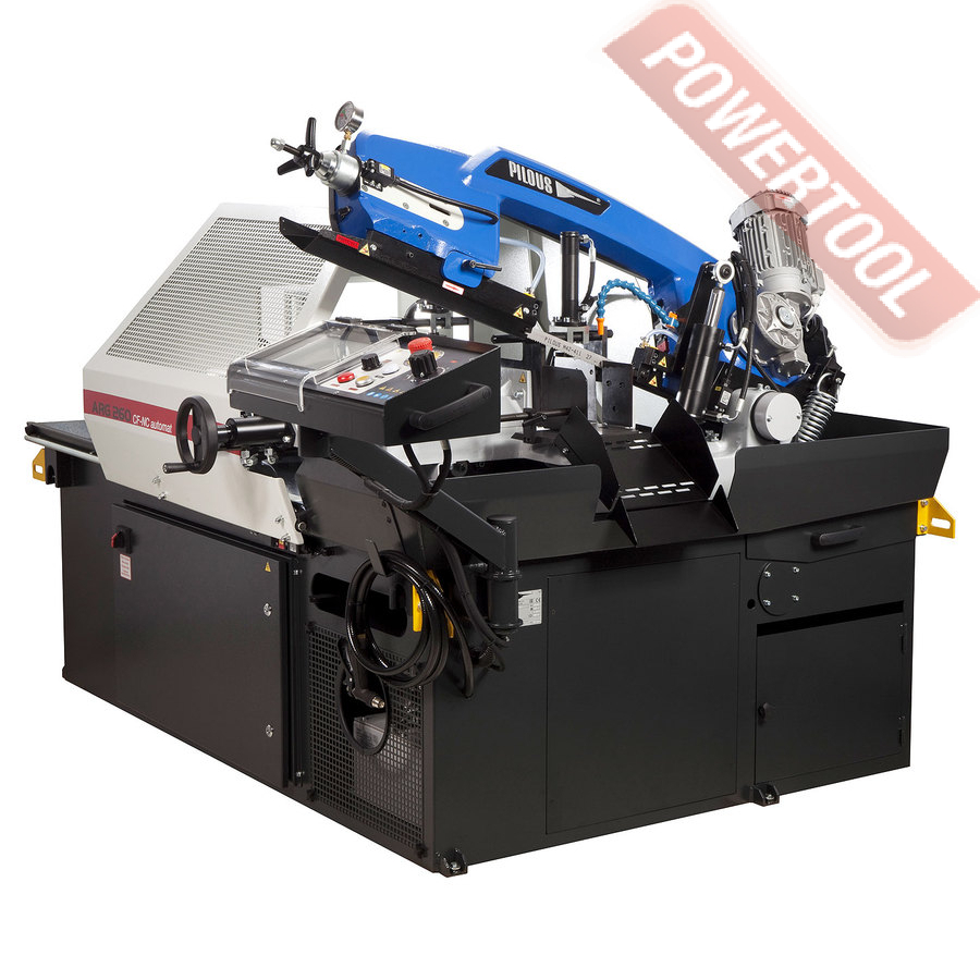 - Автоматический ленточнопильный станок. Станок оборудован высокопроизводительным промышленным гидроагрегатом. Полный цикл пиления запускается при нажатии одной кнопки - происходит зажим материала, подача заготовки в зону реза, включение вращения пилы и подачи СОЖ, распила, выключения пилы и СОЖ, подъем рамы в исходное настраиваемое положение и разжим тисков. Все это, при наличии управляемой гидравлической подачи, позволяет получить максимальную производительность, особенно при пилении больших серий и пилении труднообрабатываемых материалов сплошного сечения. При переключении в ручной режим, можно управлять всеми функциями станка по отдельности.