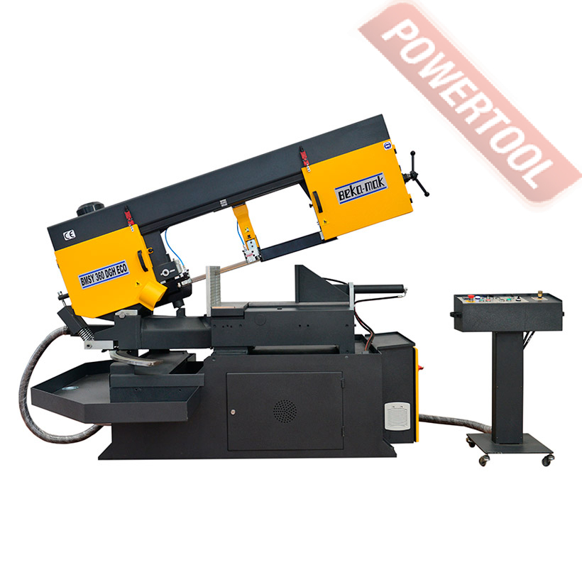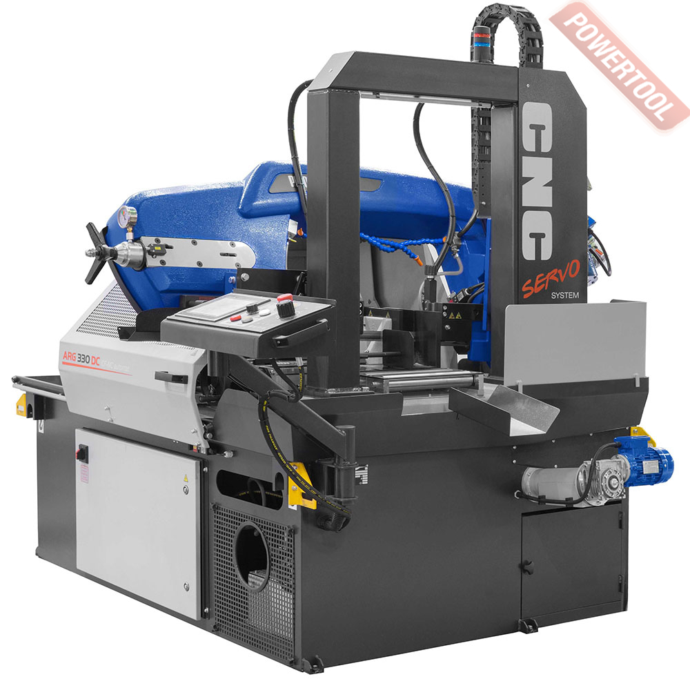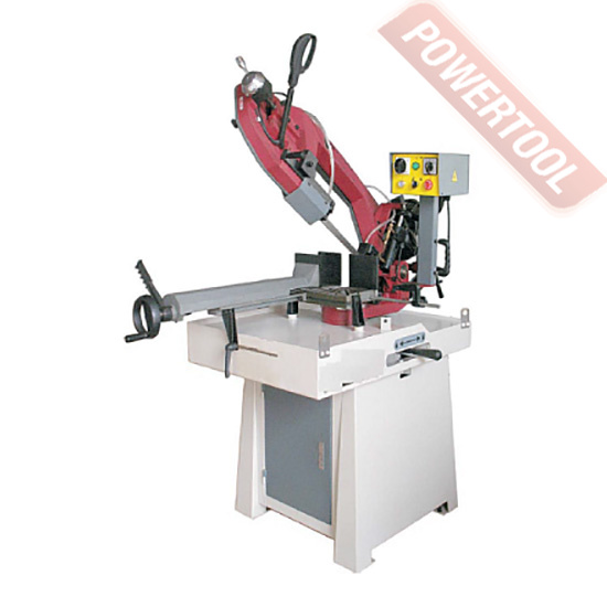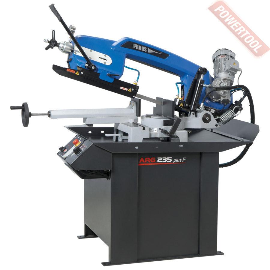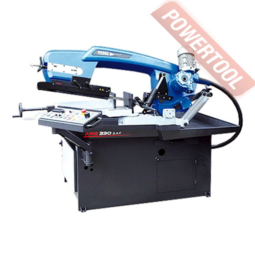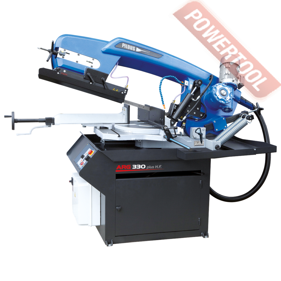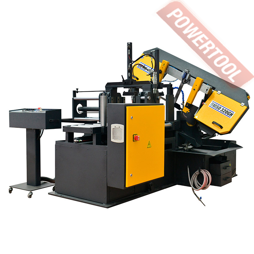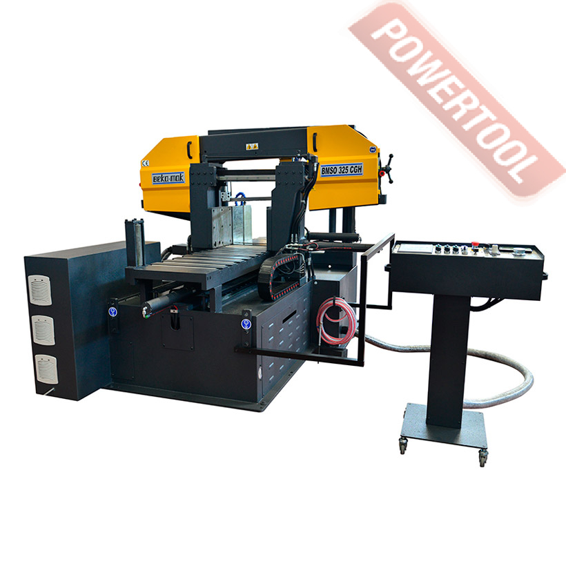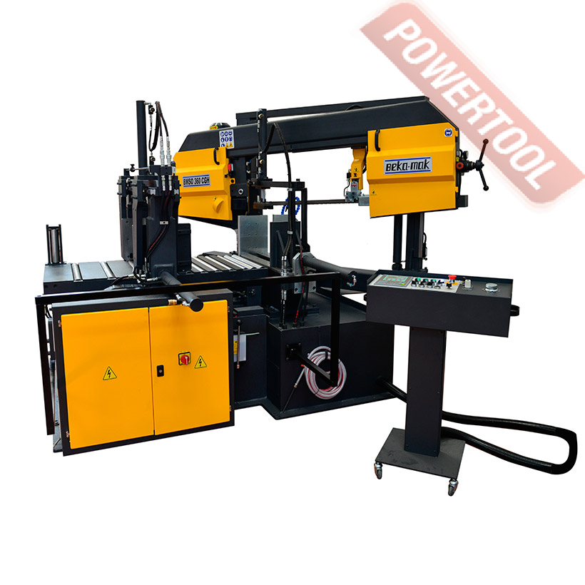- Автоматический ленточнопильный станок. Станок оборудован высокопроизводительным промышленным гидроагрегатом. Полный цикл пиления запускается при нажатии одной кнопки - происходит зажим материала, подача заготовки в зону реза, включение вращения пилы и подачи СОЖ, распила, выключения пилы и СОЖ, подъем рамы в исходное настраиваемое положение и разжим тисков. Все это, при наличии управляемой гидравлической подачи, позволяет получить максимальную производительность, особенно при пилении больших серий и пилении труднообрабатываемых материалов сплошного сечения. При переключении в ручной режим, можно управлять всеми функциями станка по отдельности.