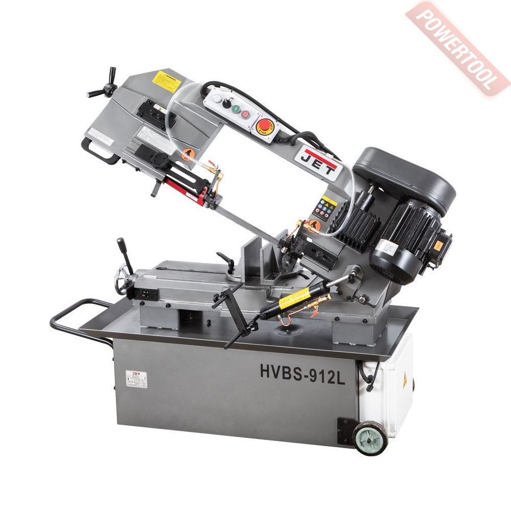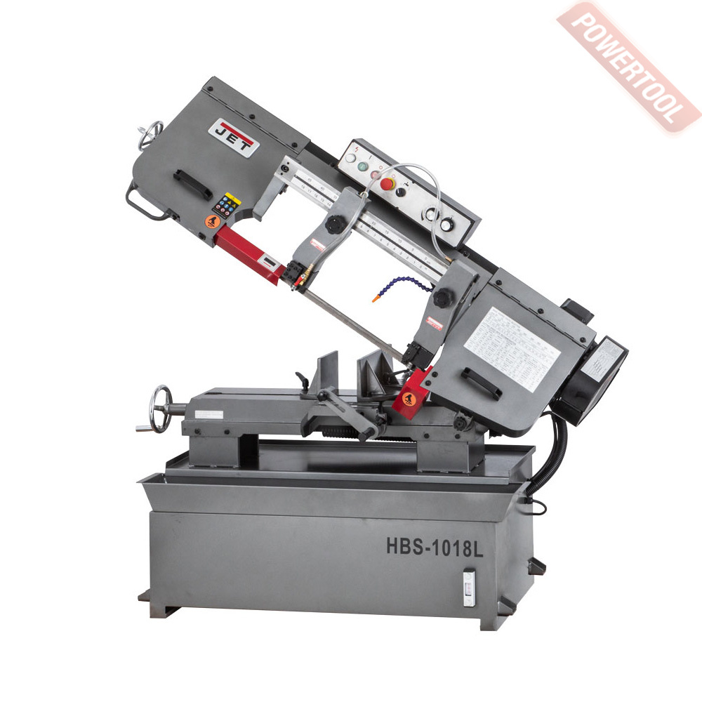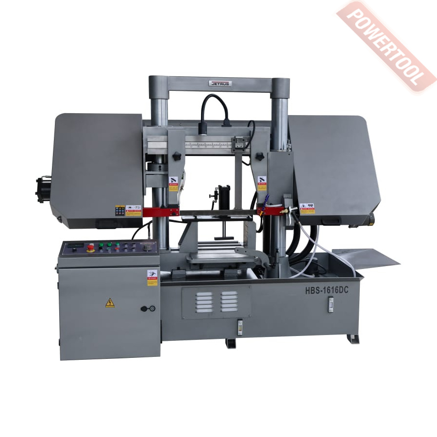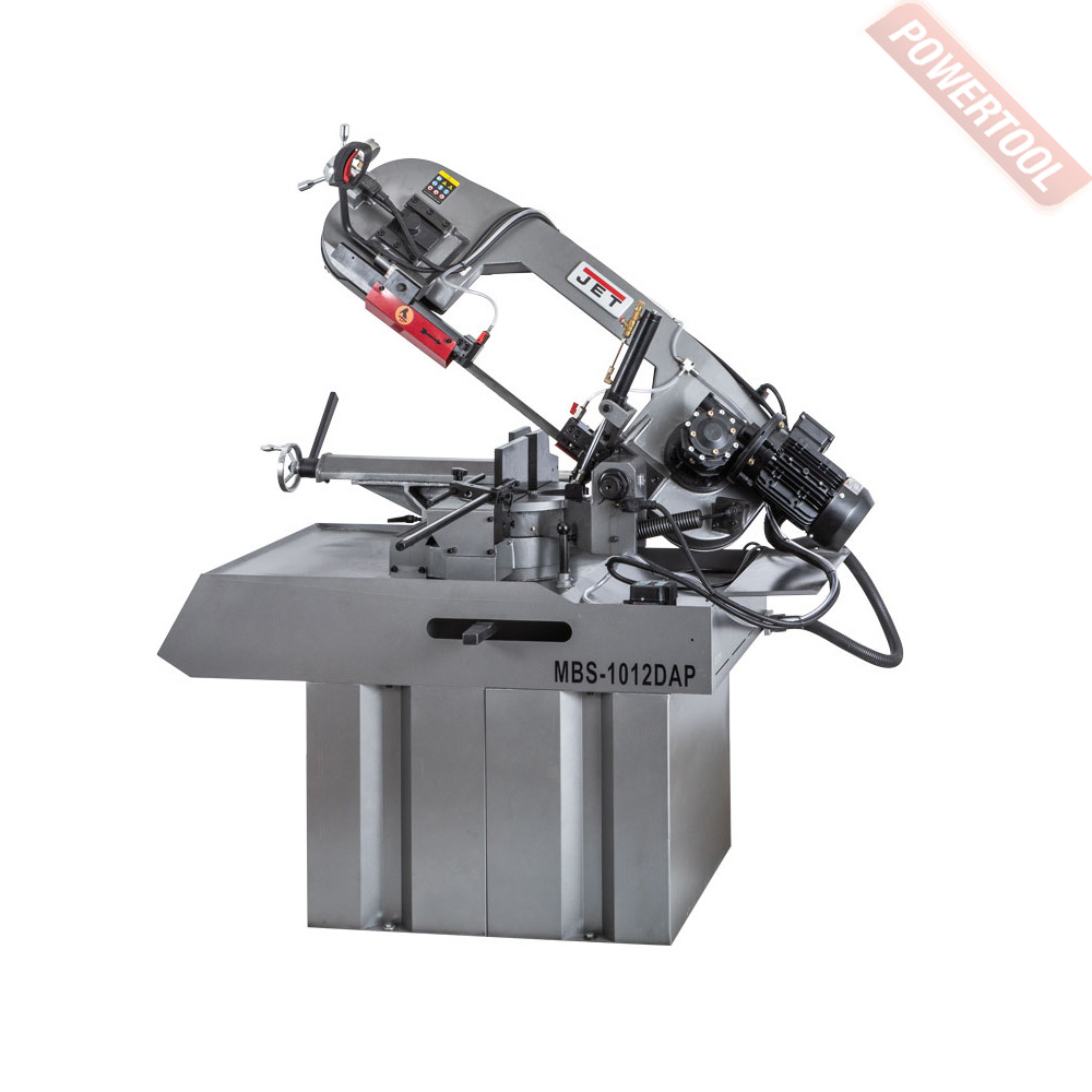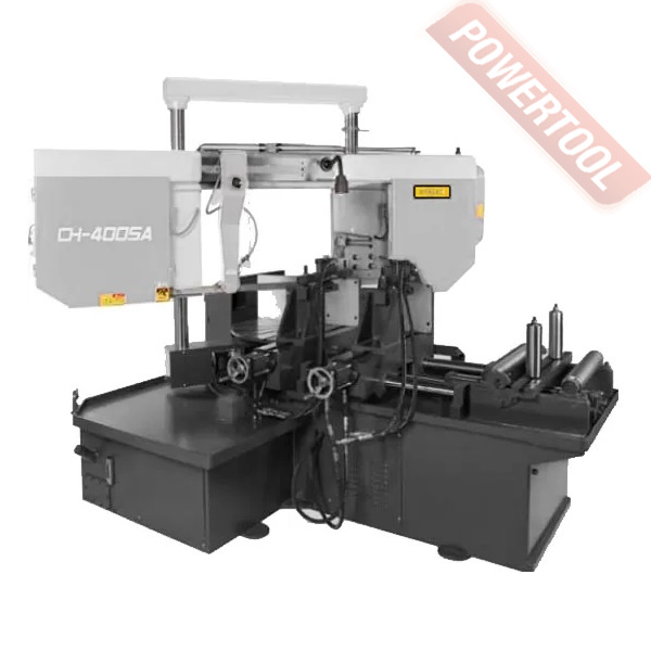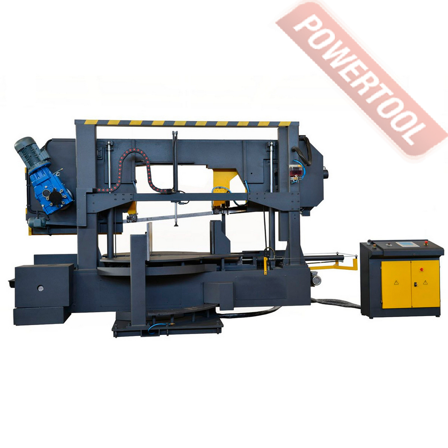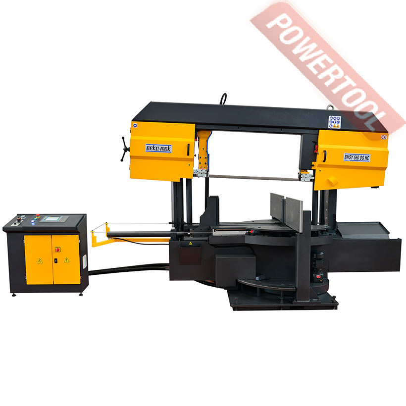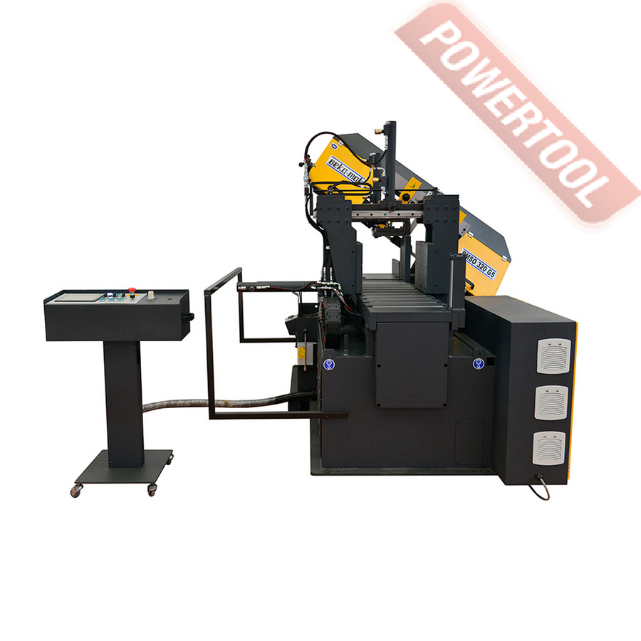 - Автоматический ленточнопильный станок. Станок оборудован высокопроизводительным промышленным гидроагрегатом. Полный цикл пиления запускается при нажатии одной кнопки - происходит зажим материала, подача заготовки в зону реза, включение вращения пилы и подачи СОЖ, распила, выключения пилы и СОЖ, подъем рамы в исходное настраиваемое положение и разжим тисков. Все это, при наличии управляемой гидравлической подачи, позволяет получить максимальную производительность, особенно при пилении больших серий и пилении труднообрабатываемых материалов сплошного сечения. При переключении в ручной режим, можно управлять всеми функциями станка по отдельности.