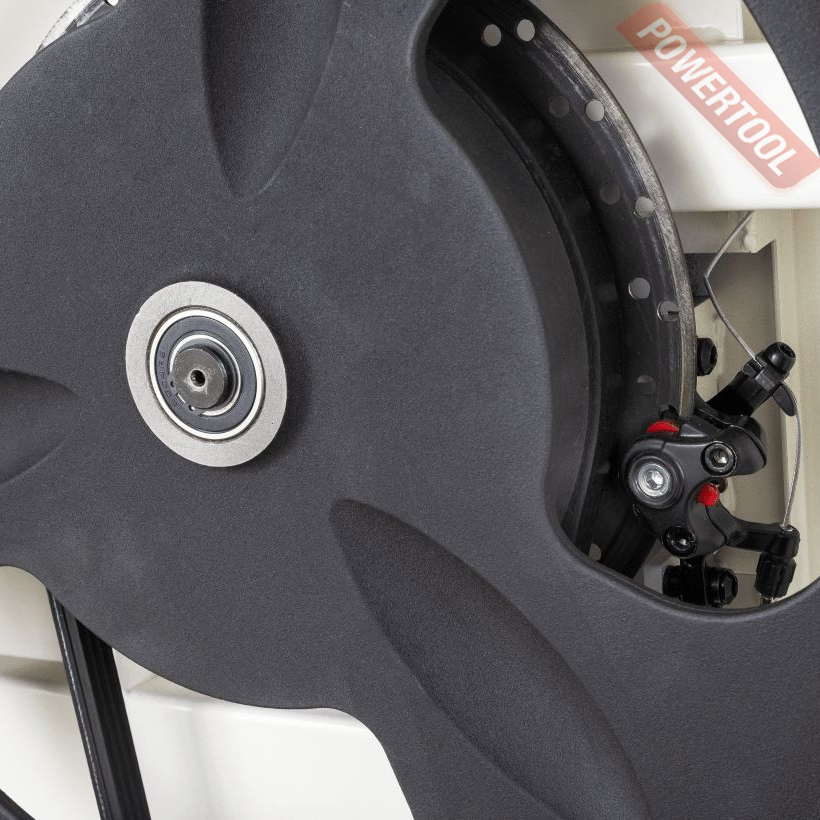 Рабочий стол чугунный. Трапеция опорно-поворотной цапфы также чугунная. Поворотные полукольца – стальные, из действительно толстой стали, мощные и устойчивые к вибрациям и износу. Наклон производится при помощи зубчатого механизма вращением рукоятки в обе стороны (на 5 градусов в сторону станка и на 45 градусов от него). Эффективное пылеудаление с обеих сторон ведущего колеса. Устроено оно двумя 100-миллиметровыми патрубками: один под рабочей поверхностью, второй в нижней части корпуса.