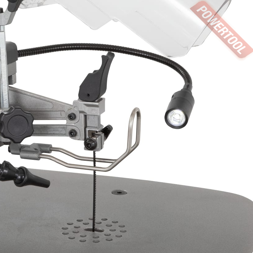 В этом станке можно использовать оба типа пилок, и со штифтами и прямые. Обдув зоны пиления через коленчатую трубку всегда можно расположить в месте, наиболее удобном для работы. Светильник подсветки тоже на гибкой стальной ноге. Он тоже не будет мешаться под руками, а будет подсвечивать именно в том месте, где он нужен. Верхнюю часть маятниковой рамы в работе можно легко поднимать в вернее положение для того, чтобы быстро продеть пилку через следующее отверстие и продолжить пилить.