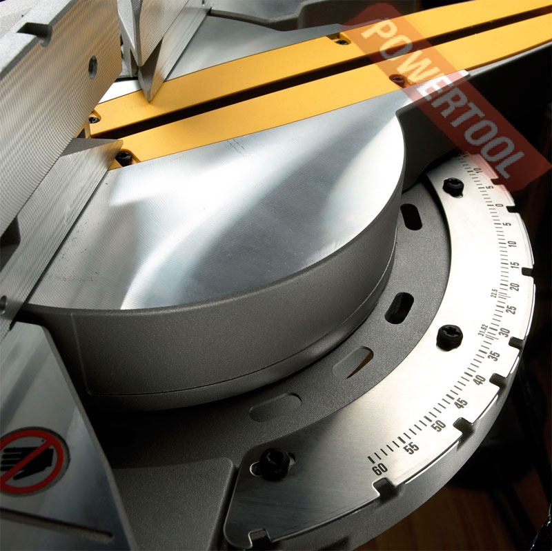 Торцовочная пила DeWALT DW 717 XPS имеет кулачковый зажим для быстрого и точного изменения угла резания 0°-60° влево и 0°-50° вправо.