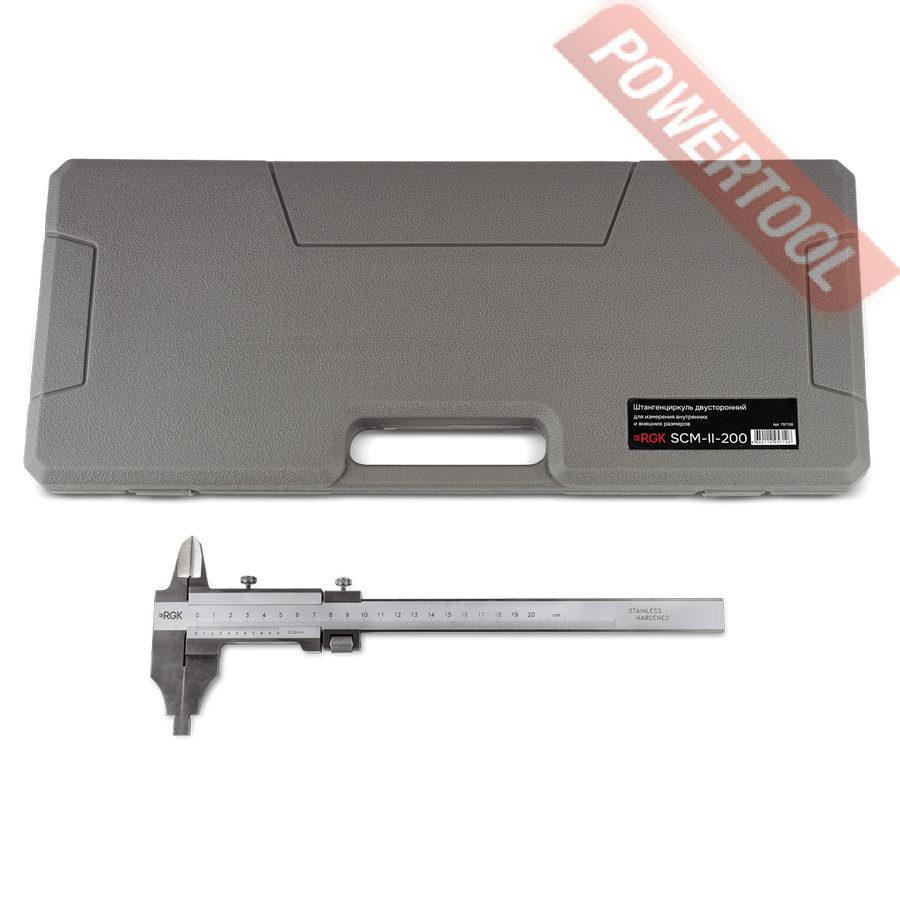 Штангенциркуль механический RGK SCM-II-200 с поверкой, где SC означает - штангенциркуль, M - механический, II - второй тип, а 200 - это максимальное значение измерений в мм.