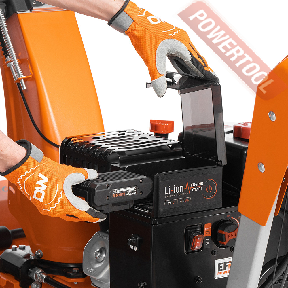 - Электрозапуск от аккумулятора. Благодаря установленному Li-ion аккумулятору на 21В, двигатель запускается простым нажатием кнопки на рукоятке управления. Обеспечивает легкий запуск холодного двигателя при любых температурах до -30 градусов C.