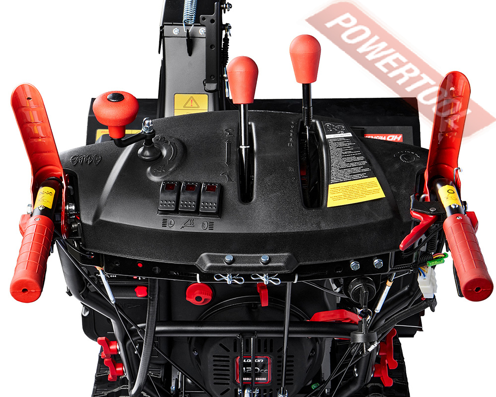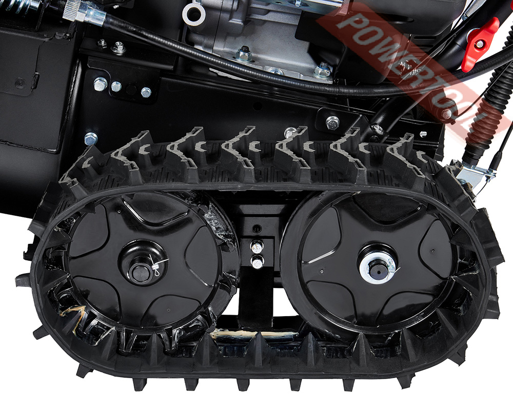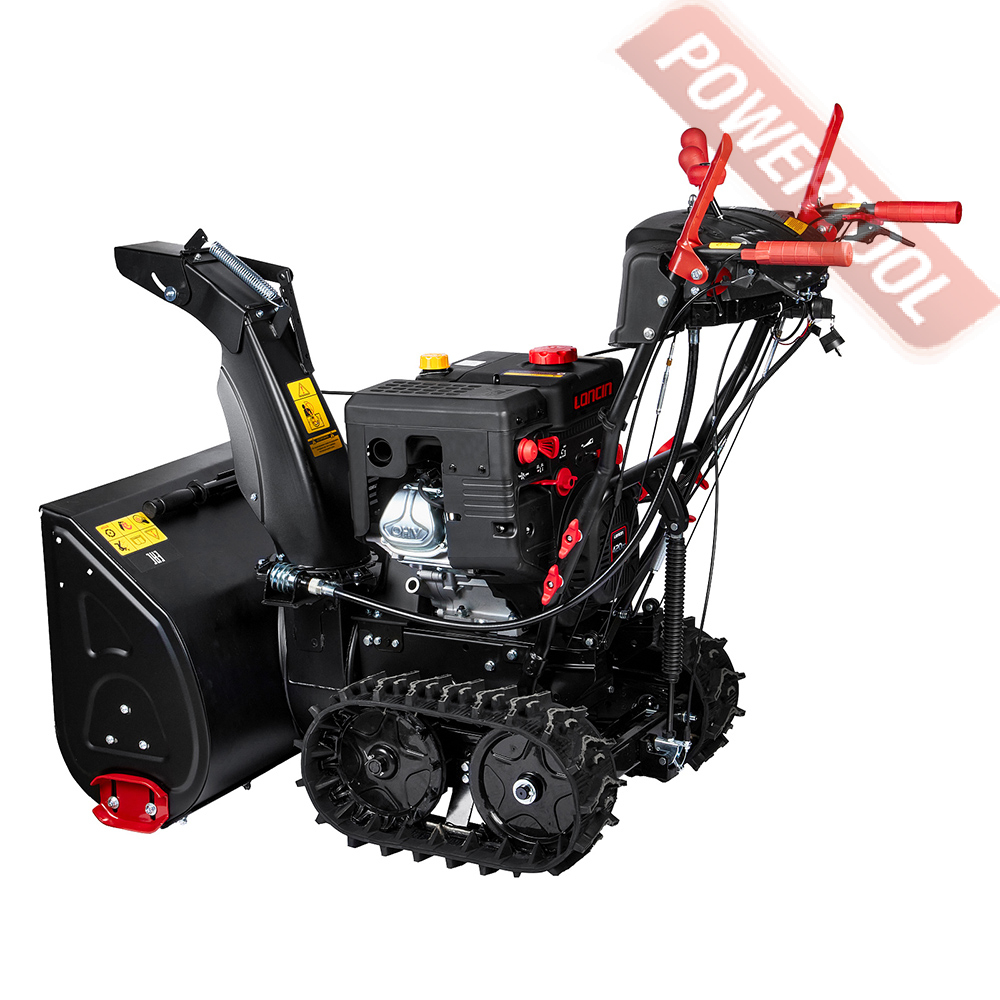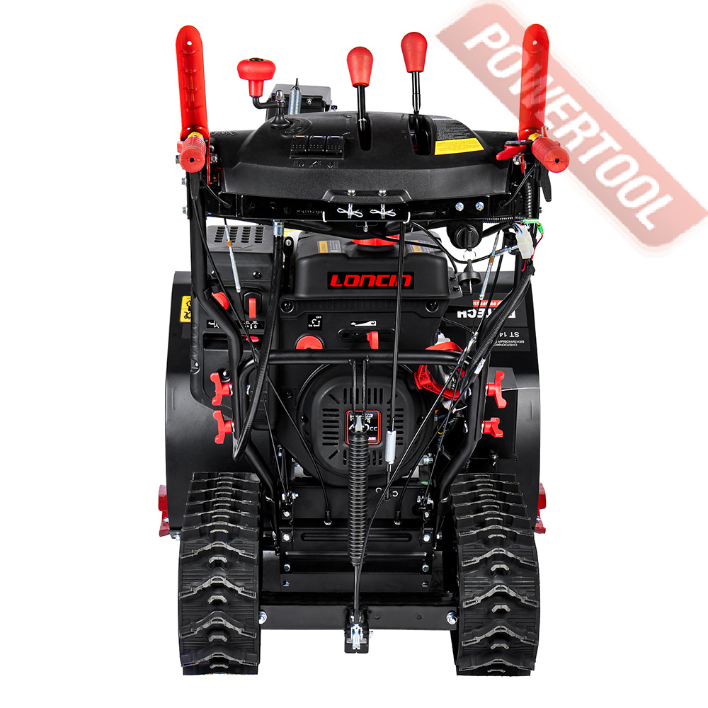 Снегоуборщик гусеничный самоходный, ширина ковша 76 см, высота ковша 54,5 см, скорости 6 вперед и 2 назад, выбор направления и дальности выброса снега рукоятками с панели оператора, угол поворота желоба 190 градусов, дальность выброса достигает до 15 м, разблокировка гусениц двумя курками под каждой рукояткой, подогрев рукояток, LED-фара, гусеницы 88х13,8 см, 4-тактный бензиновый двигатель Loncin LC190FDS объемом 420 куб.см мощностью 14 л.с., электростартер от аккумулятора 12 В, топливный бак 5,5 л, расход топлива 1,2 л/ч, емкость картера 1,1 л, трансмиссия фрикционный диск, вес 130 кг.