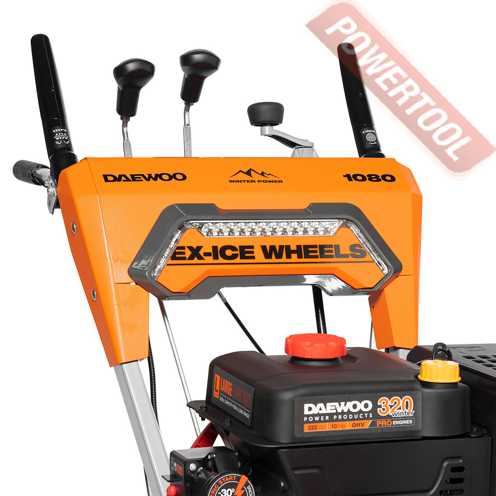 Снегоуборщик колесный самоходный, ширина ковша 77 см, высота ковша 55 см, скорости 5 вперед и 2 назад, выбор направления и дальности выброса снега рукоятками с панели оператора, угол поворота желоба 180 градусов, дальность выброса достигает до 16 м, материал желоба сталь, управление одной рукой, разблокировка дифференциала курком под одной из рукояток, подогрев рукояток, двухсоставные направляющие лыжи, LED фара, защита от ржавчины ZN+, колеса EX-ICE 150/25-R8, 4-тактный бензиновый двигатель DAEWOO 320 winter объемом 323 куб.см и мощностью 10 л.с., электростартер от сети 220 В, топливный бак 4,6 л, объем картера 0,95 л, размеры упаковки 1130х850х835 мм, вес 123 кг.