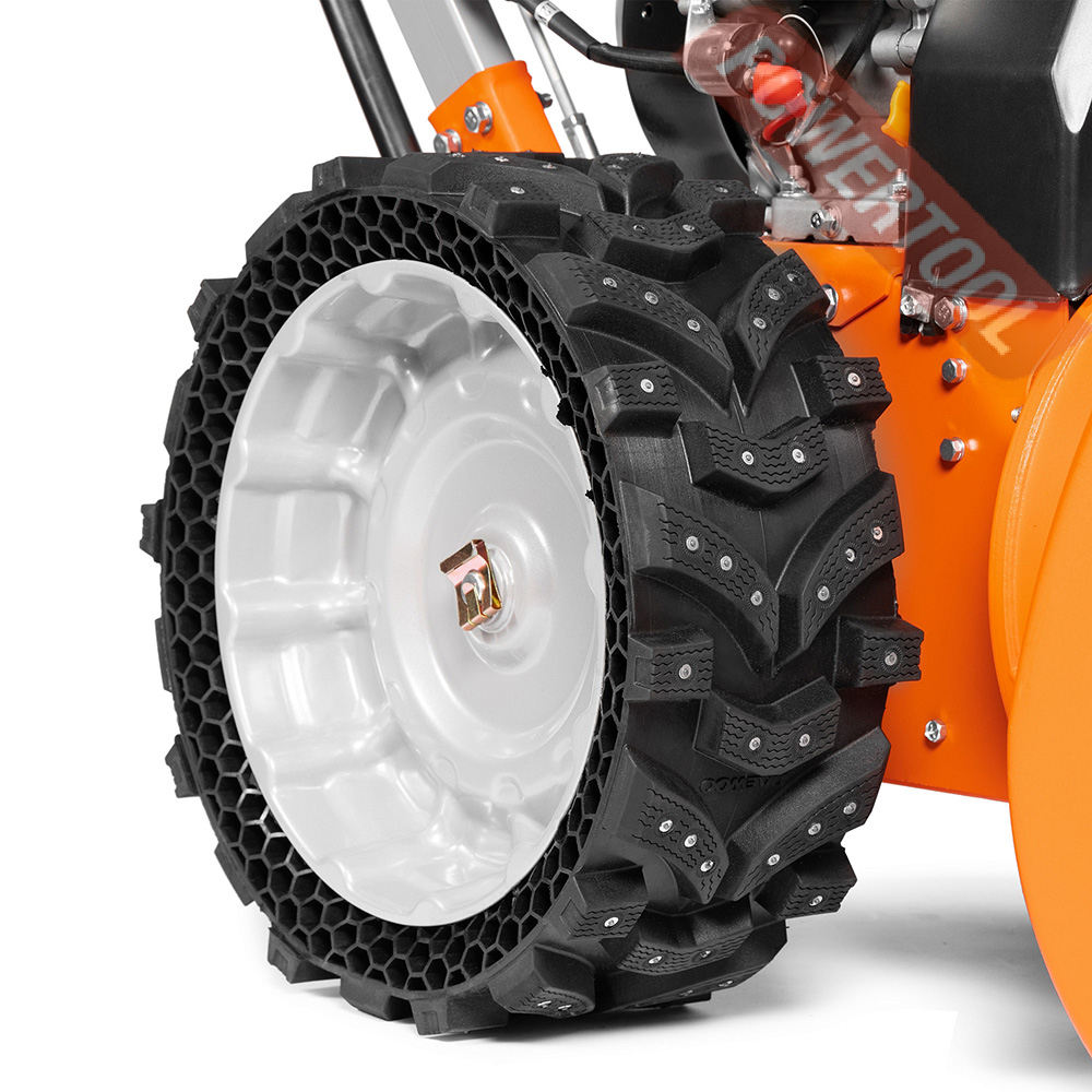 • Уникальные колеса EX‑ICE WHEELS. Широкие безвоздушные колеса созданы специально для снегоуборщиков. Колеса EX‑ICE обладают лучшим сцеплением с поверхностью среди всех зимних шин. Лучшая проходимость и маневренность в классе снегоуборщиков.