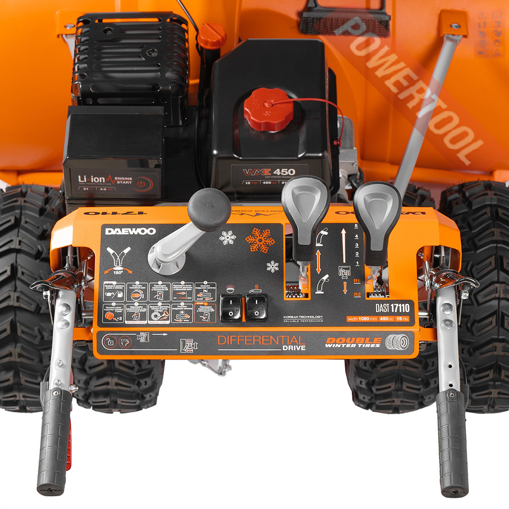 - Электрозапуск от аккумулятора 21В. Запуск двигателя путем нажатия кнопки Start. Питание от аккумулятора DAEWOO 21 Volt. Легкий запуск в любые морозы и возможность использования аккумулятора с инструментом линейки DAEWOO 21В.