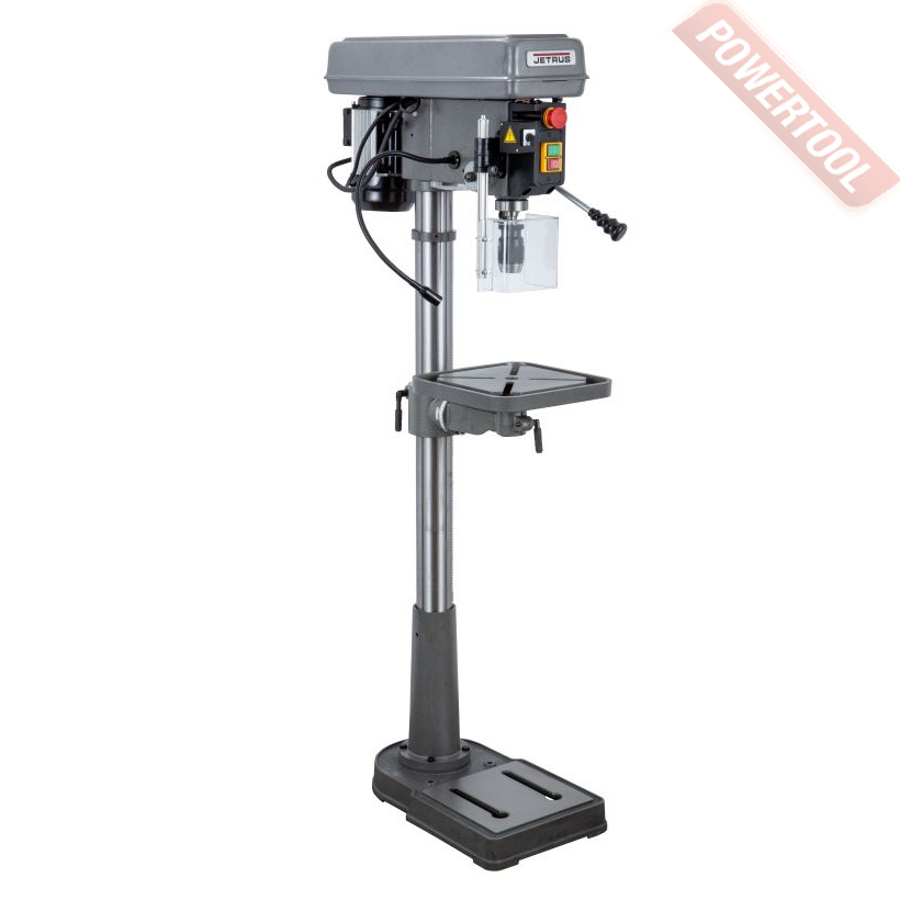 Сверлильный станок JET JDP-10L сверлильный станок, предназначенный для любительской работы с деревом и другими материалами. Несмотря на ограничения по интенсивности эксплуатации, он имеют все функции и системы, присущие профессиональным аналогам. Для контроля перемещения пиноли шпинделя предусмотрен лимб (круговая шкала), есть регулировка рабочего стола по наклону и высоте. Важное достоинство - надёжное исполнение с металлическими шкивами передачи и качественными ремнями, а также наличие конуса шпинделя МК2, что позволяет использовать сверла с коническим хвостовиком. Разработчики JET решили проблему «рывков» при сверлении благодаря установке на JDP-10L зубчатого клинового ремня плавного хода. Однофазный индукционный двигатель мощностью в 450 Вт практически бесшумный, благодаря широкой крыльчатке хорошо охлаждается. Кожух зубчатого ремня оснащен шарниром, что позволяет быстро добраться до узла.