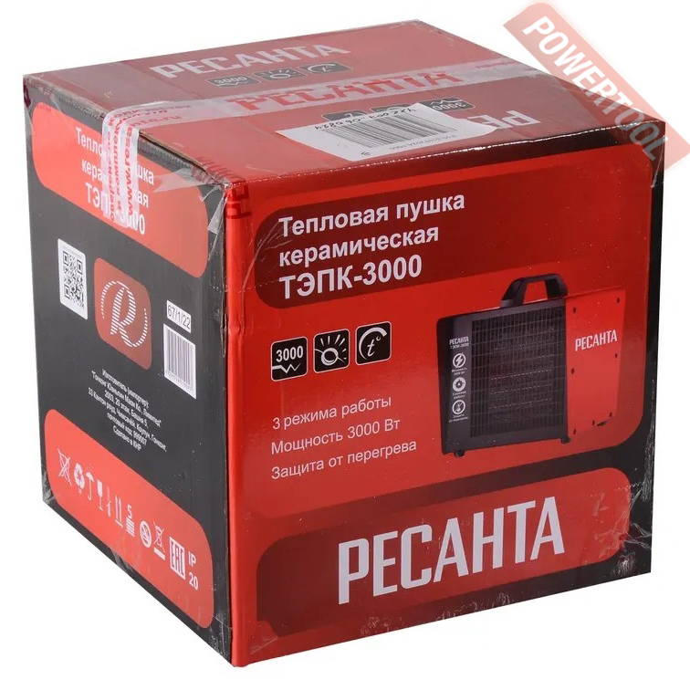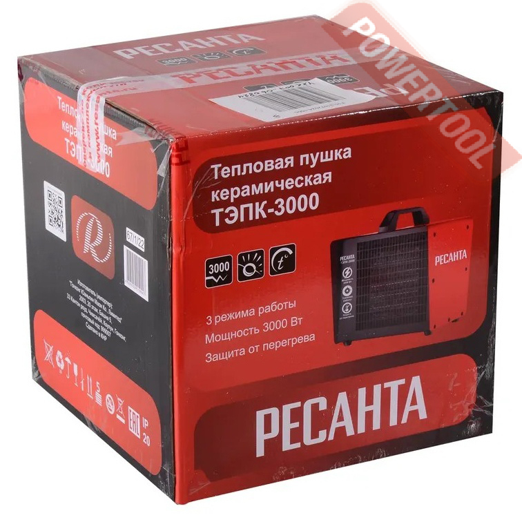 Тепловая пушка электрическая РЕСАНТА ТЭПК-3000 - компактная тепловая пушка с керамическим нагревательным элементом способна эффективно обогреть квартиру, офис, магазин, бытовку, гараж и т.д. Нагревательный элемент из керамики не перегревается, долговечен и обеспечивает экономичный расход электроэнергии, не сушит воздух в помещении и не сжигает кислород. Тепловую пушку можно оставлять на долгое время и не бояться за сохранность помещения. За счет большой площади теплообмена и высокой частоты вращения вентилятора воздух быстро прогревается. Конструктивные меры безопасности (термопредохранитель, терморегулятор) защищают Вас и изделие при нештатных ситуациях.