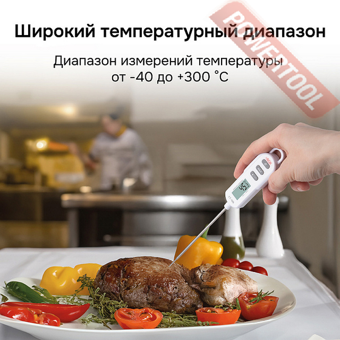 Контактный погружной пищевой термометр, внесён в госреестр СИ РФ, диапазон измерения от -40 до 300 градусов С, погрешность 2 градуса С при Т от -40 до -20 градусов С, 1 градус С при Т от -20 до 0 градусов С, 0,5 градуса С при Т от 0 до 150 градусов С, 1 градус С при Т от 150 до 100 градусов С, 2 градуса С при Т от 250 до 300 градусов С, температурное разрешение 0,1 градуса С, единицы измерения C/F, зонд NTC, длина зонда 128 мм, питание от 1 батареи 3В СR2032, защита от влаги и пыли IP66, индикатор удержания значения, магнитный держатель, габариты ДхШхВ 107х30х15 мм, вес 0,04 кг, элементы питания, поверка.
