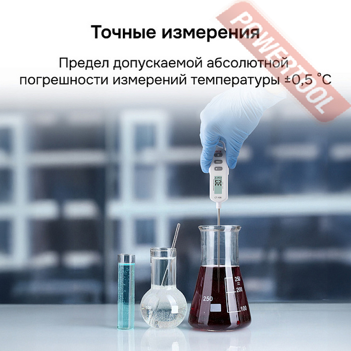Термометр контактный пищевой RGK CT-106 служит для контактного измерения температурных параметров целевых объектов в пределах от -40 до +300 градусов C, обеспечивая точность ±0,5 градуса С в диапазоне от -20 до +150 градусов С. Инструмент оснащен батарейным питанием и несъемным заостренным и утонченным в передней части погружным зондом, оболочка которого изготовлена из пищевой нержавеющей стали, позволяющим оперативно определять температуру внутри жидких, вязких, сыпучих веществ и материалов, продуктов питания и т.п. Изделие характеризуется высоким быстродействием за счет малого времени отклика и подходит для бытового и профессионального применения.