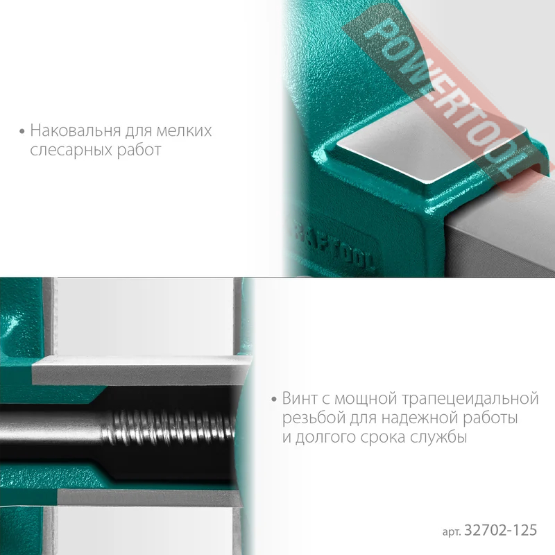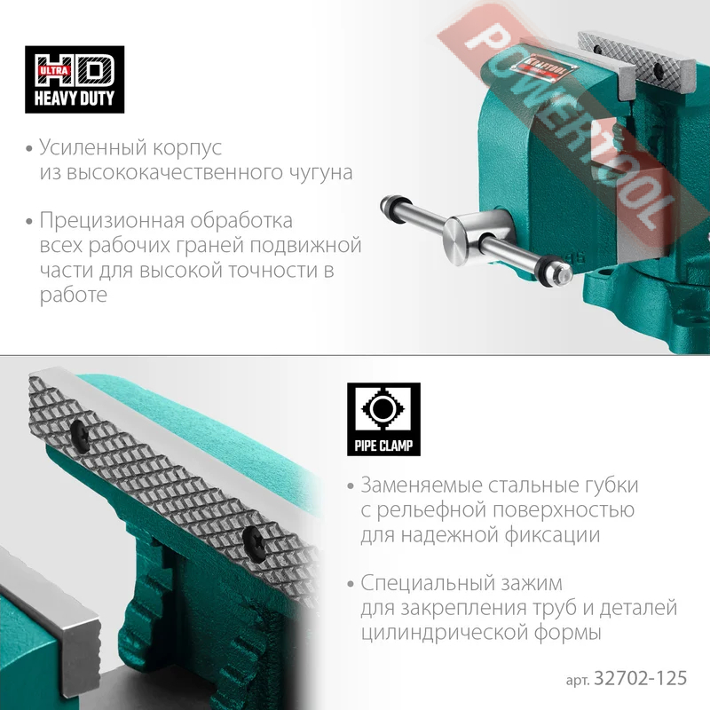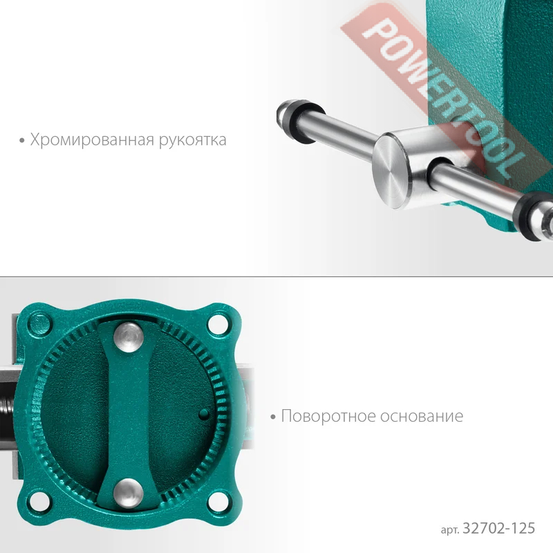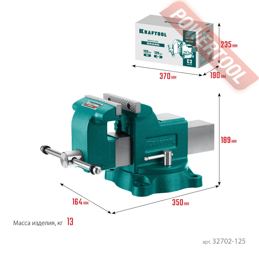 Тиски слесарные поворотные, ширина губок 125 мм, рабочий ход 125 мм, глубина зева 75 мм, наковальня, трубный зажим, функция поворота 360 градусов, размер ДхШхВ 350х164х189 мм, вес 13 кг.